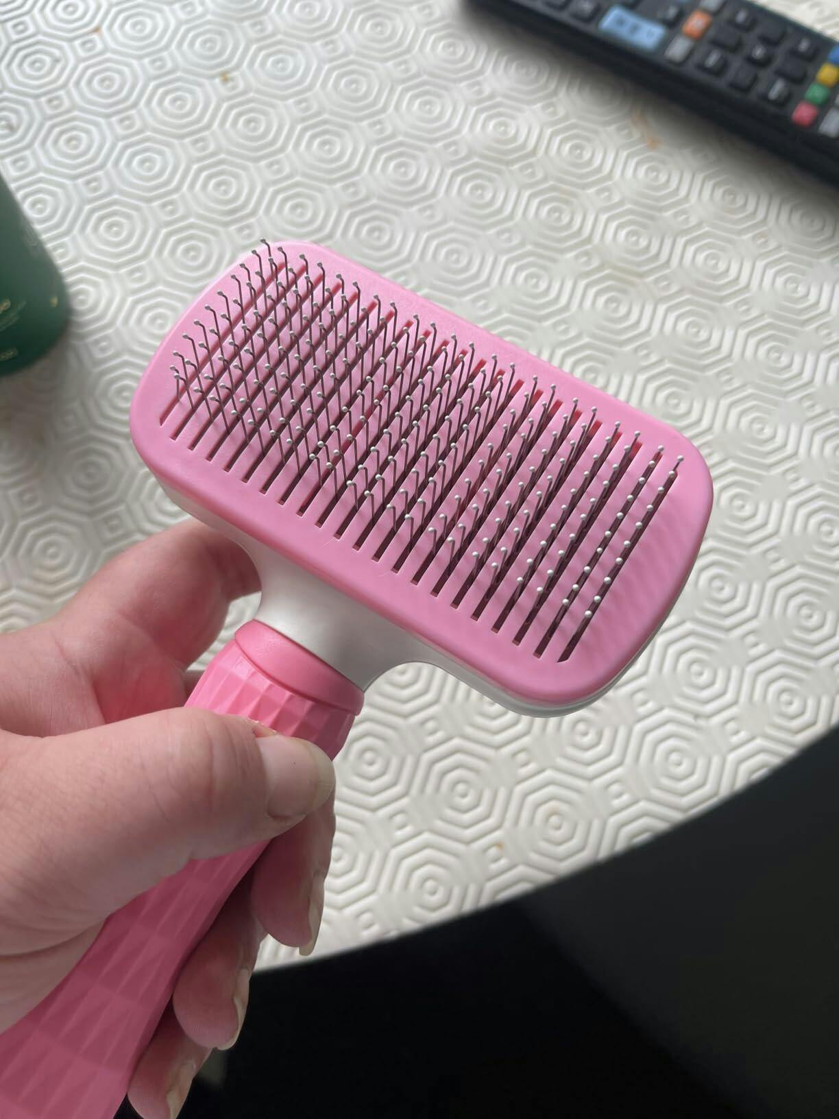 - Once the brush is filled with hair, press the self-cleaning button to retract the bristles and release the hair.
