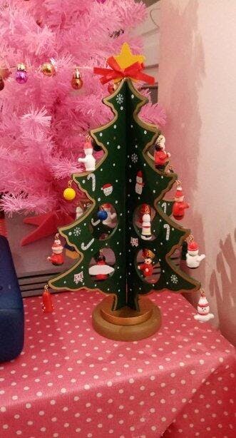 2. Wooden Christmas Tree with Ornaments – Tabletop Festive Decor