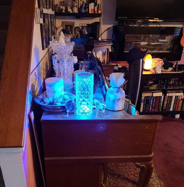 Colour changing LED lamp appears to be a decorative table lamp. It features a diamond rose design and LED lighting with multiple colour options.