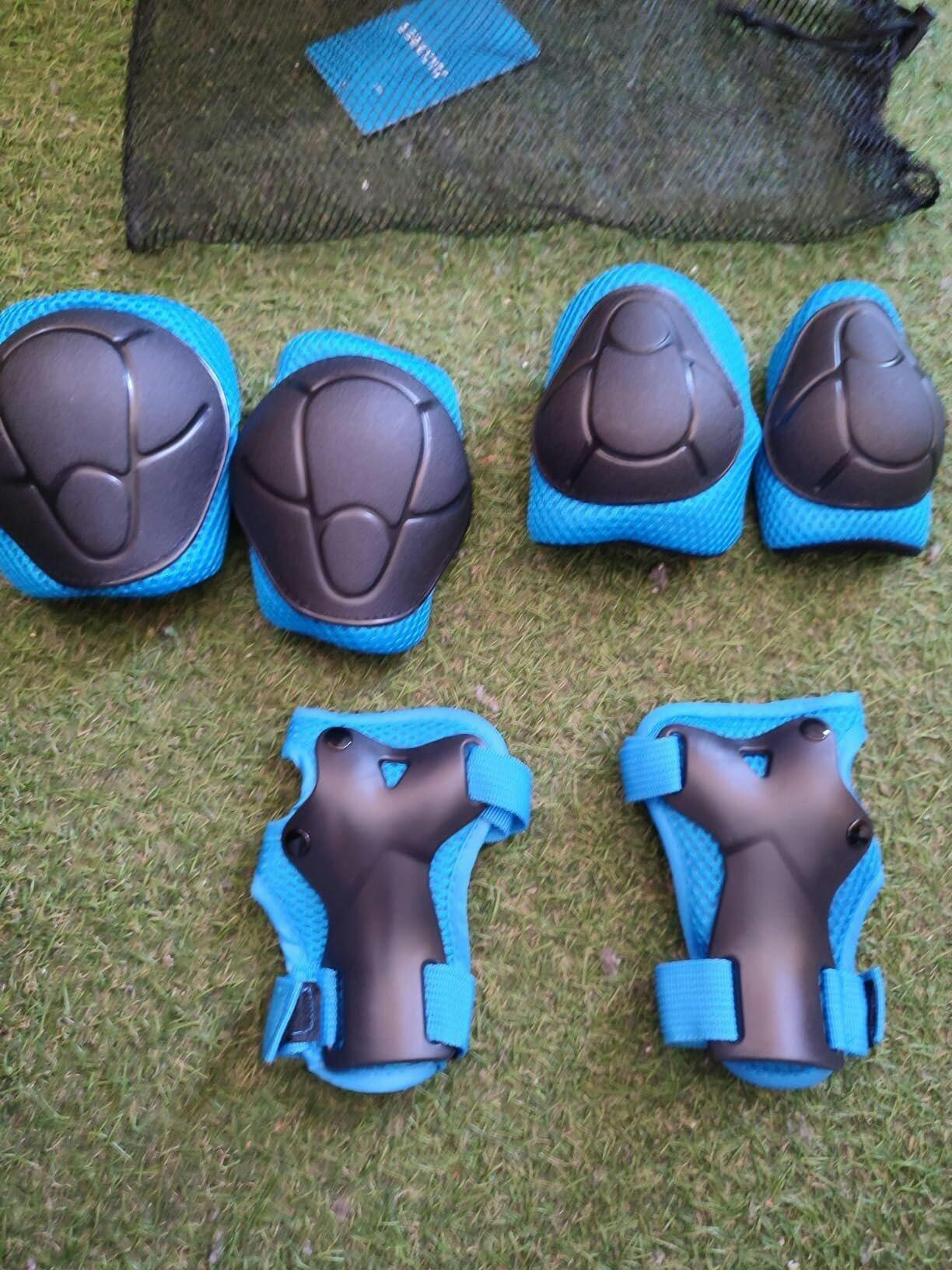 The wrist guards, elbow, and knee pads guard against injury to the knees, elbows, and wrists.