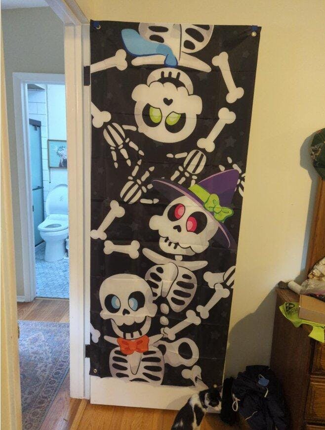 Featuring a hauntingly detailed skeleton design, this door cover creates an eerie focal point for your Halloween decor. The striking visuals are sure to capture the attention of all your guests and trick-or-treaters!