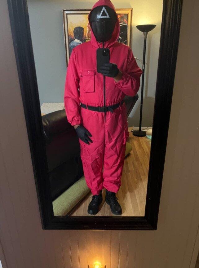 The jumpsuit features a simple zip closure, making it easy to put on and take off. The accompanying mask adds an element of mystery, completing your transformation into a Squid Game guard.