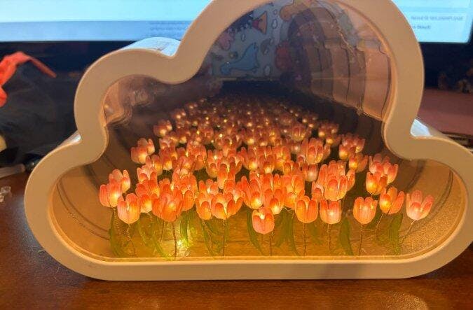 The night light is typically handmade using high-quality materials such as fabric, wood, or synthetic materials to create the cloud shape. Manufacturers often make the tulip night lamp from glass or acrylic.