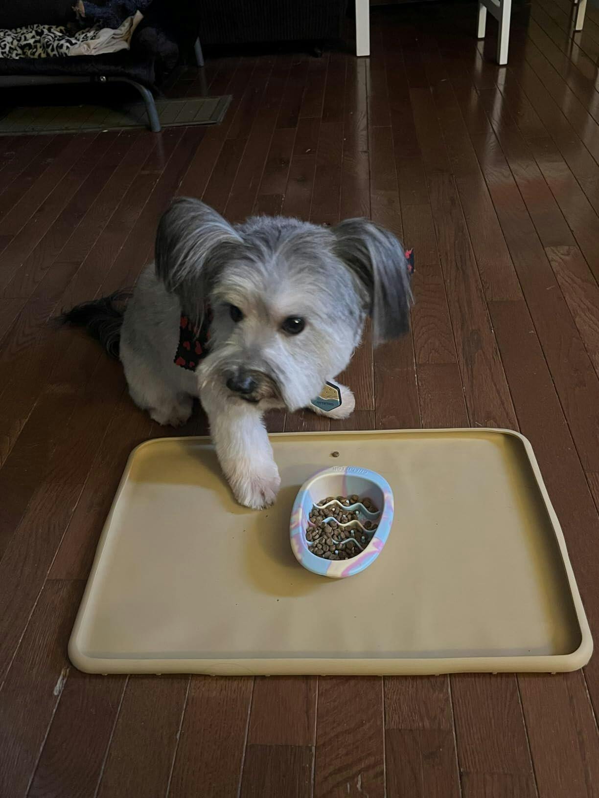 - Position your raised dog feeder, gravity water dispenser, or pet dishes on the mat and place the pet food tray on the floor. They will stay put because of the non-slip surface.
