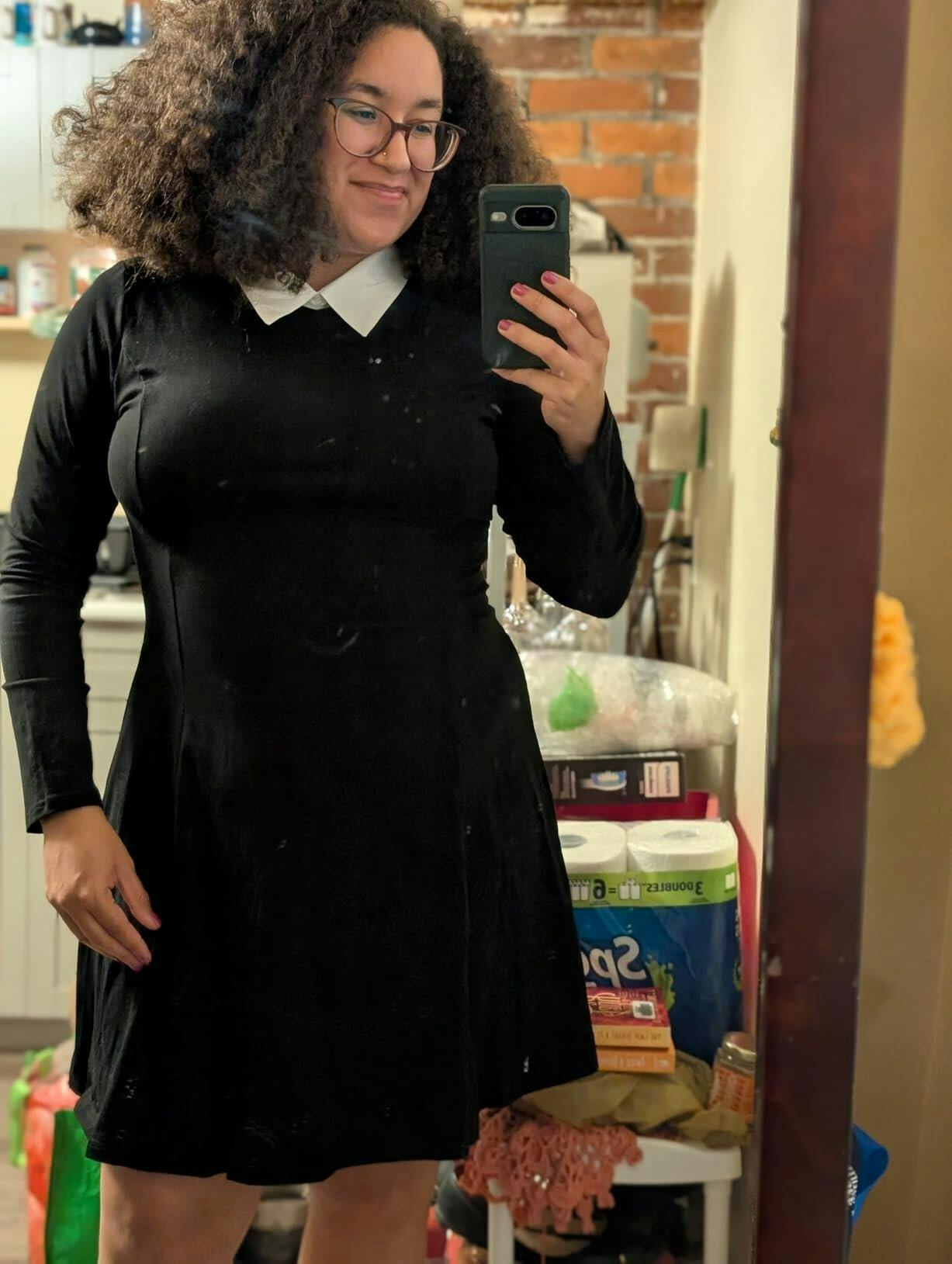 Inspired by the iconic character from The Family, this costume features a stylish black dress with a white collar. Capturing Wednesday's signature look.