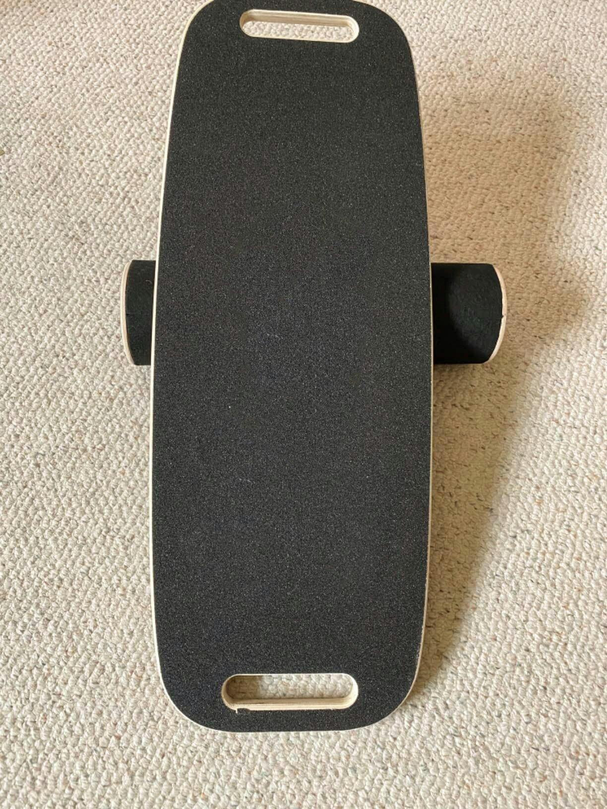 The balancing board has a solid hardwood deck that gives users a steady surface on which to stand and engage in exercise.